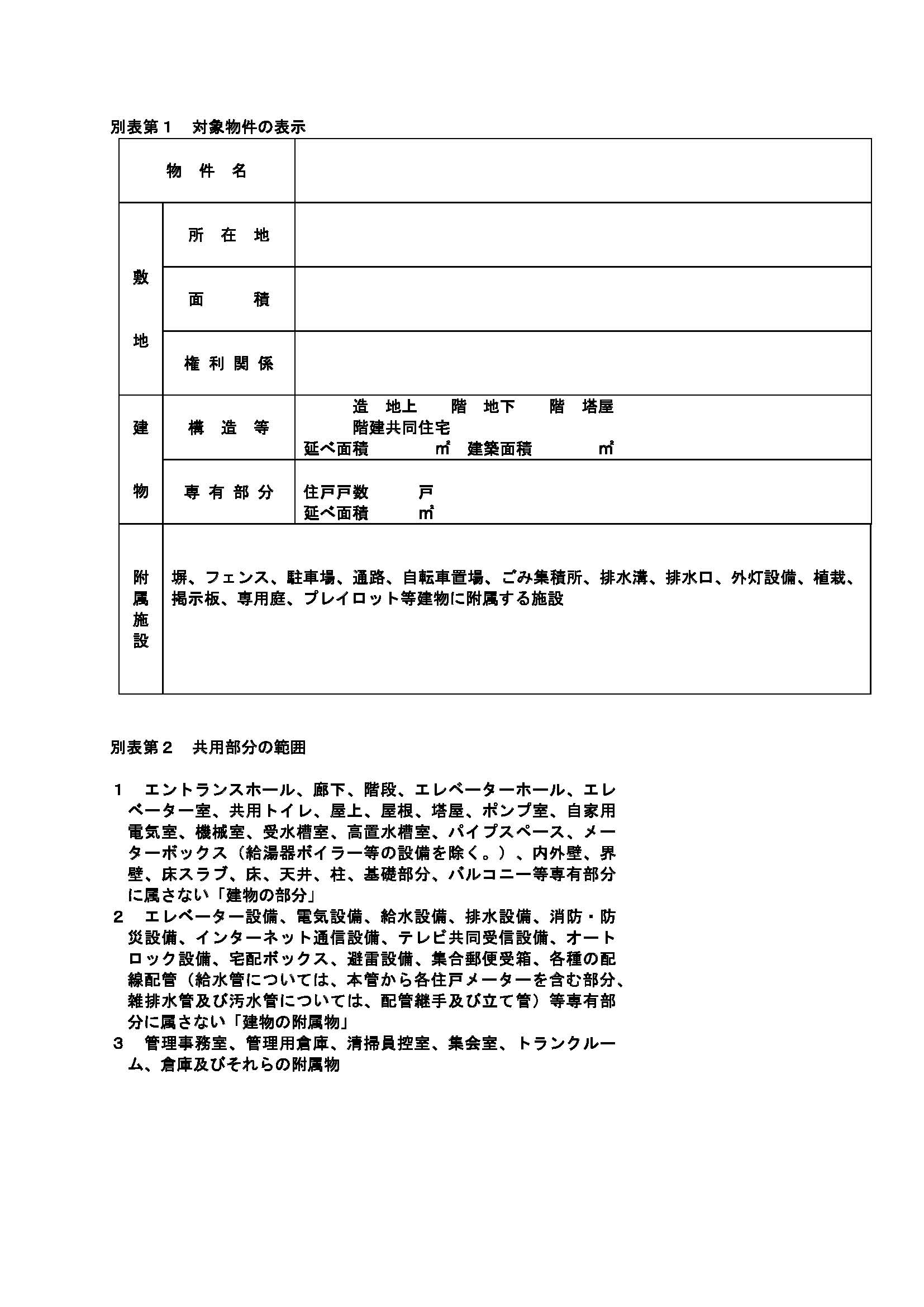 第1章 総則 (目的) 第1条 この規約は、○○マンションの管理又は使用に関する事項等について定めることにより、区分所有者の共同の利益を増進し、良好な住環境を確保することを目的とする。 (定義) 第2条 この規約において、次の各号に掲げる用語の意義は、それぞれ当該各号に定めるところによる。 一 区分所有権 一棟の建物に構造上区分された数個の部分で独立して住居、店舗、事務所又は倉庫その他建物としての用途に供することができるものがあるときのその各部分をいう。ただし、規約によって共用部分とされたものを除く。 二 区分所有者 区分所有権を有する者をいう。 三 占有者 区分所有者以外の者であって、専用部分を占有する者をいう。 四 専有部分 区分所有権の目的たる建物の部分をいう。 五 共用部分 専有部分以外の建物の部分、及び専有部分に属しない建物の附属物をいう。また、規約によって共用部分とされた建物の部分及び附属の建物をいう。 六 敷地 建物が所在する土地をいう。また、区分所有者が建物及び建物が所在する土地と一体として管理又は使用する庭、通路その他の土地のうち、規約によって建物の敷地とされたものをいう。 七 共用部分等 共用部分及び附属施設をいう。 八 専用使用権 敷地及び共用部分等の一部について、特定の区分所有者が排他的に使用できる権利をいう。 九 専用使用部分 専用使用権の対象となっている敷地及び共用部分等の部分をいう。 十 電磁的記録 電子計算機に備えられたファイル又は電磁的記録媒体(電子的方式、磁気的方式その他人の知覚によっては認識することができない方式で作られる記録であって電子計算機による情報処理の用に供されるものに係る記録媒体をいう。)をもって調製するファイルに情報を記録したものをいう。 十一 WEB会議システム等 電気通信回線を介して、即時性及び双方向性を備えた映像及び音声の通信を行うことができる会議システム等をいう。 十二 国内管理人 区分所有者が国内に住所又は居所を有せず、又は有しないことになる場合において、その専有部分及び共用部分の管理に関する事務を行なわせる目的で特に選任する管理人をいう。 (規約及び総会の決議の遵守義務) 第3条 区分所有者は、円滑な共同生活を維持するため、この規約及び総会の決議を誠実に遵守しなければならない。 2 区分所有者は、同居する者に対してこの規約及び総会の決議を遵守させなければならない。 (対象物件の範囲) 第4条 この規約の対象となる物件の範囲は、別表第1に記載された敷地、建物及び附属施設(以下「対象物件」という。)とする。 (規約及び総会の決議の効力) 第5条 この規約及び総会の決議は、区分所有者の包括承継人及び特定承継人に対しても、その効力を有する。 2 占有者は、対象物件の使用方法につき、区分所有者がこの規約及び総会の決議に基づいて負う義務と同一の義務を負う。 (管理組合) 第6条 区分所有者は、区分所有法第3条に定める建物並びにその敷地及び附属施設の管理を行うための団体として、第1条に定める目的を達成するため、区分所有者全員をもって○○マンション管理組合(以下「管理組合」という。)を構成する。 2 管理組合は、事務所を○○内に置く。 3 管理組合の業務、組織等については、第6章に定めるところによる。 第2章 専有部分等の範囲 (専有部分の範囲) 第7条 対象物件のうち区分所有権の対象となる専有部分は、住戸番号を付した住戸とする。 2 前項の専有部分を他から区分する構造物の帰属については、次のとおりとする。 一 天井、床及び壁は、躯体部分を除く部分を専有部分とする。 二 玄関扉は、錠及び内部塗装部分を専有部分とする。 三 窓枠及び窓ガラスは、専有部分に含まれないものとする。 3 第1項又は前項の専有部分の専用に供される設備のうち共用部分内にある部分以外のものは、専有部分とする。 (共用部分の範囲) 第8条 対象物件のうち共用部分の範囲は、別表第2に掲げるとおりとする。 第3章 敷地及び共用部分等の共有 (共有) 第9条 対象物件のうち敷地及び共用部分等は、区分所有者の共有とする。 (共有持分) 第10条 各区分所有者の共有持分は、別表第3に掲げるとおりとする。 (分割請求及び単独処分の禁止) 第11条 区分所有者は、敷地又は共用部分等の分割を請求することはできない。 2 区分所有者は、専有部分と敷地及び共用部分等の共有持分とを分離して譲渡、抵当権の設定等の処分をしてはならない。 第4章 用法 (専有部分の用途) 第12条 区分所有者は、その専有部分を専ら住宅として使用するものとし、他の用途に供してはならない。 2 区分所有者は、その専有部分を住宅宿泊事業法(平成29年法律第65号)第3条第1項の届出を行って営む同法第2条第3項の住宅宿泊事業に使用してはならない。 (敷地及び共用部分等の用法) 第13条 区分所有者は、敷地及び共用部分等をそれぞれの通常の用法に従って使用しなければならない。 (バルコニー等の専用使用権) 第14条 区分