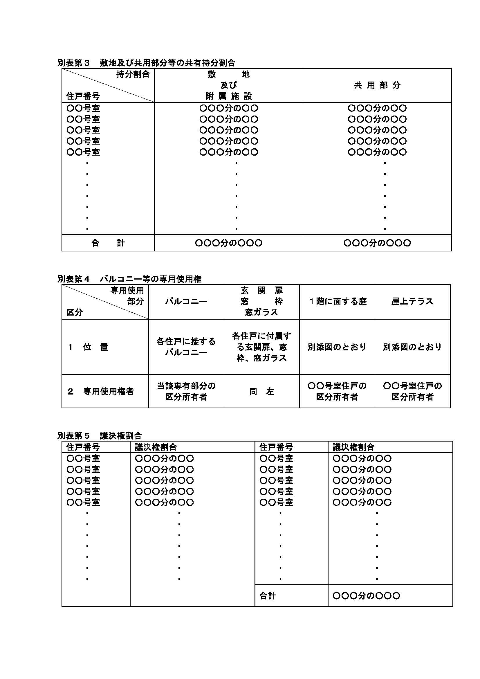 第1章 総則 (目的) 第1条 この規約は、○○マンションの管理又は使用に関する事項等について定めることにより、区分所有者の共同の利益を増進し、良好な住環境を確保することを目的とする。 (定義) 第2条 この規約において、次の各号に掲げる用語の意義は、それぞれ当該各号に定めるところによる。 一 区分所有権 一棟の建物に構造上区分された数個の部分で独立して住居、店舗、事務所又は倉庫その他建物としての用途に供することができるものがあるときのその各部分をいう。ただし、規約によって共用部分とされたものを除く。 二 区分所有者 区分所有権を有する者をいう。 三 占有者 区分所有者以外の者であって、専用部分を占有する者をいう。 四 専有部分 区分所有権の目的たる建物の部分をいう。 五 共用部分 専有部分以外の建物の部分、及び専有部分に属しない建物の附属物をいう。また、規約によって共用部分とされた建物の部分及び附属の建物をいう。 六 敷地 建物が所在する土地をいう。また、区分所有者が建物及び建物が所在する土地と一体として管理又は使用する庭、通路その他の土地のうち、規約によって建物の敷地とされたものをいう。 七 共用部分等 共用部分及び附属施設をいう。 八 専用使用権 敷地及び共用部分等の一部について、特定の区分所有者が排他的に使用できる権利をいう。 九 専用使用部分 専用使用権の対象となっている敷地及び共用部分等の部分をいう。 十 電磁的記録 電子計算機に備えられたファイル又は電磁的記録媒体(電子的方式、磁気的方式その他人の知覚によっては認識することができない方式で作られる記録であって電子計算機による情報処理の用に供されるものに係る記録媒体をいう。)をもって調製するファイルに情報を記録したものをいう。 十一 WEB会議システム等 電気通信回線を介して、即時性及び双方向性を備えた映像及び音声の通信を行うことができる会議システム等をいう。 十二 国内管理人 区分所有者が国内に住所又は居所を有せず、又は有しないことになる場合において、その専有部分及び共用部分の管理に関する事務を行なわせる目的で特に選任する管理人をいう。 (規約及び総会の決議の遵守義務) 第3条 区分所有者は、円滑な共同生活を維持するため、この規約及び総会の決議を誠実に遵守しなければならない。 2 区分所有者は、同居する者に対してこの規約及び総会の決議を遵守させなければならない。 (対象物件の範囲) 第4条 この規約の対象となる物件の範囲は、別表第1に記載された敷地、建物及び附属施設(以下「対象物件」という。)とする。 (規約及び総会の決議の効力) 第5条 この規約及び総会の決議は、区分所有者の包括承継人及び特定承継人に対しても、その効力を有する。 2 占有者は、対象物件の使用方法につき、区分所有者がこの規約及び総会の決議に基づいて負う義務と同一の義務を負う。 (管理組合) 第6条 区分所有者は、区分所有法第3条に定める建物並びにその敷地及び附属施設の管理を行うための団体として、第1条に定める目的を達成するため、区分所有者全員をもって○○マンション管理組合(以下「管理組合」という。)を構成する。 2 管理組合は、事務所を○○内に置く。 3 管理組合の業務、組織等については、第6章に定めるところによる。 第2章 専有部分等の範囲 (専有部分の範囲) 第7条 対象物件のうち区分所有権の対象となる専有部分は、住戸番号を付した住戸とする。 2 前項の専有部分を他から区分する構造物の帰属については、次のとおりとする。 一 天井、床及び壁は、躯体部分を除く部分を専有部分とする。 二 玄関扉は、錠及び内部塗装部分を専有部分とする。 三 窓枠及び窓ガラスは、専有部分に含まれないものとする。 3 第1項又は前項の専有部分の専用に供される設備のうち共用部分内にある部分以外のものは、専有部分とする。 (共用部分の範囲) 第8条 対象物件のうち共用部分の範囲は、別表第2に掲げるとおりとする。 第3章 敷地及び共用部分等の共有 (共有) 第9条 対象物件のうち敷地及び共用部分等は、区分所有者の共有とする。 (共有持分) 第10条 各区分所有者の共有持分は、別表第3に掲げるとおりとする。 (分割請求及び単独処分の禁止) 第11条 区分所有者は、敷地又は共用部分等の分割を請求することはできない。 2 区分所有者は、専有部分と敷地及び共用部分等の共有持分とを分離して譲渡、抵当権の設定等の処分をしてはならない。 第4章 用法 (専有部分の用途) 第12条 区分所有者は、その専有部分を専ら住宅として使用するものとし、他の用途に供してはならない。 2 区分所有者は、その専有部分を住宅宿泊事業法(平成29年法律第65号)第3条第1項の届出を行って営む同法第2条第3項の住宅宿泊事業に使用してはならない。 (敷地及び共用部分等の用法) 第13条 区分所有者は、敷地及び共用部分等をそれぞれの通常の用法に従って使用しなければならない。 (バルコニー等の専用使用権) 第14条 区分